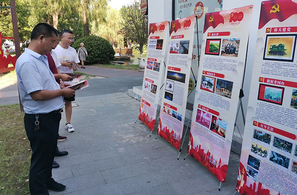 7月23日下午,“寄邮思,传党史”实践团在抗战胜利广场,开展了“邮票上的党史”宣传海报展。宣传海报共五个展板,包括伟大建党、井冈山精神到建党百年等17个代表性历史事件的邮票图片,配有对应的历史解说,还放置有四本纪念邮票册与红色书籍,吸引来许多市民。团队成员向路人散发“邮票上的党史”宣传册,并赠送党史纪念明信片,还向市民介绍宣传海报中的党史内容,得到了市民的高度赞扬。一个高中生向团队活动表达了羡慕之情,还兴奋地指出团队队服的图案正是南湖红船,展示了较好的党史知识储备。