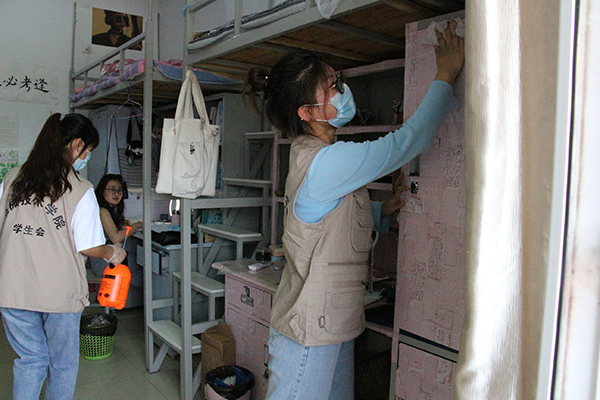 志愿者们为学生宿舍消毒
