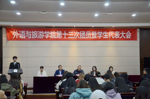 2019年11月19日下午,外语与旅游学院第十三次团员代表暨学生代表大会在青春剧场隆重召开。外语与旅游学院党总支书记江铭、学工办主任周嫄以及院团总支负责老师及135名代表参加了大会。