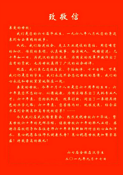 活动现场气氛热烈,30余位年过七旬老校友高唱《农机校校歌》和《共创辉煌-星空app官网之歌》,齐声朗诵献给母校的《致敬信》,深切的感谢母校的栽培。大家畅叙校友之谊和对母校的思念之情,无不为母校60年来取得的成就感到骄傲,衷心祝愿母校的明天更美好。