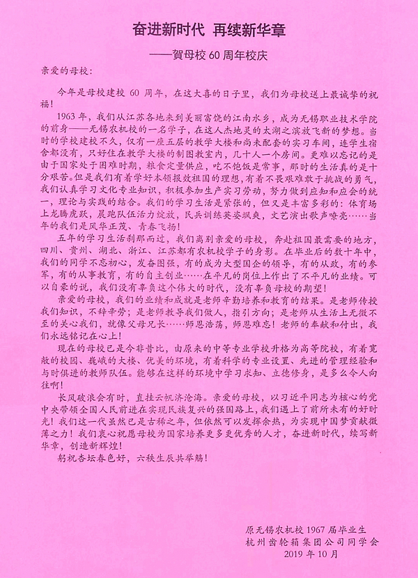 在我校60周年校庆即将来临之际,我校1967届杭州齿轮箱集团公司同学会发来贺信,向母校及全体锡职人表示祝贺,衷心祝愿母校“为国家培养更多更优秀的人才,奋进新时代,续写新华章,创造新辉煌”。