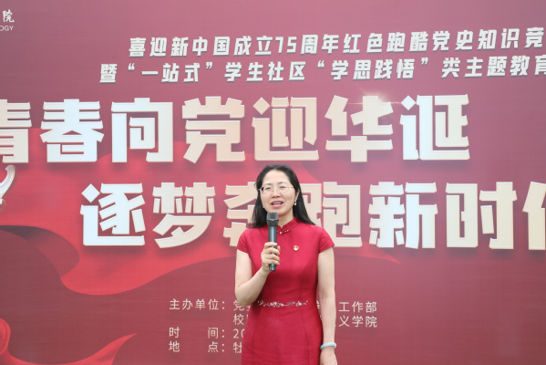 为庆祝中国共产党成立103周年,喜迎新中国成立75周年,深入开展党史、新中国史、改革开放史、社会主义发展史宣传教育,推动党史学习教育深入人心,强化党的创新理论铸魂育人,6月11日,校党委宣传部、党委学生工作部、团委、马克思主义学院在牡丹园体育场联合举办“青春向党迎华诞•逐梦奔跑新时代”喜迎新中国成立75周年红色跑酷党史知识竞赛暨“一站式”学生社区“学思践悟”类主题教育。各二级学院11支学生代表队参加竞赛,校党委副书记杨雪琴莅临指导。