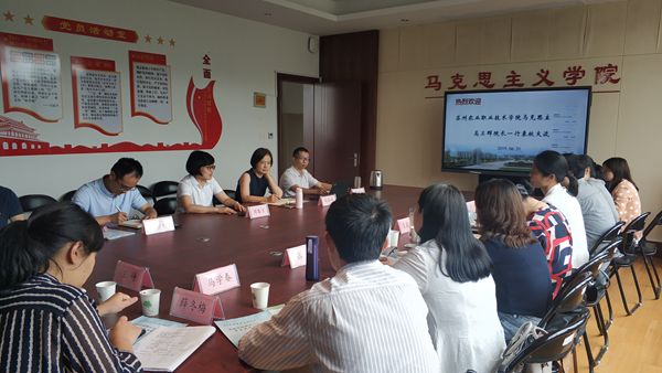 交流中,双方介绍了各自在思政课课程设置、师资建设、教学改革、教研科研等方面的特色与经验,就如何通过思政课程促进习近平新时代中国特色社会主义思想铸魂育人,打造思政“金课”进行了探讨,还就在线课程建设、课程思政的载体建设等问题展开讨论。苏州农业职业技术学院马克思主义学院在思政课程专题化教学,信息化教学、讨论式教学等方面的优秀经验和做法给予我校思政课教师很好的启迪。