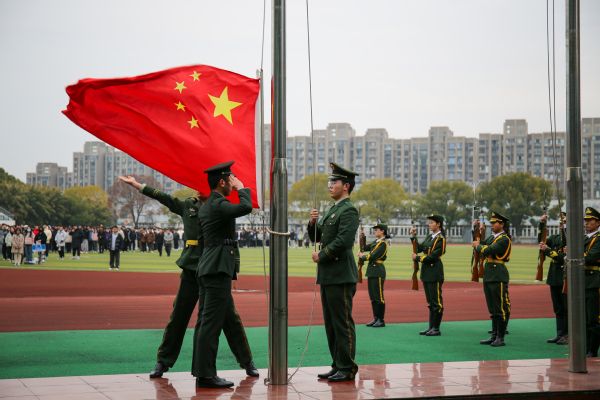 国旗护卫队队员昂首挺胸,迈着铿锵有力的步伐,护送五星红旗入场。鲜艳的国旗冉冉升起,全体师生行注目礼,奏唱国歌。