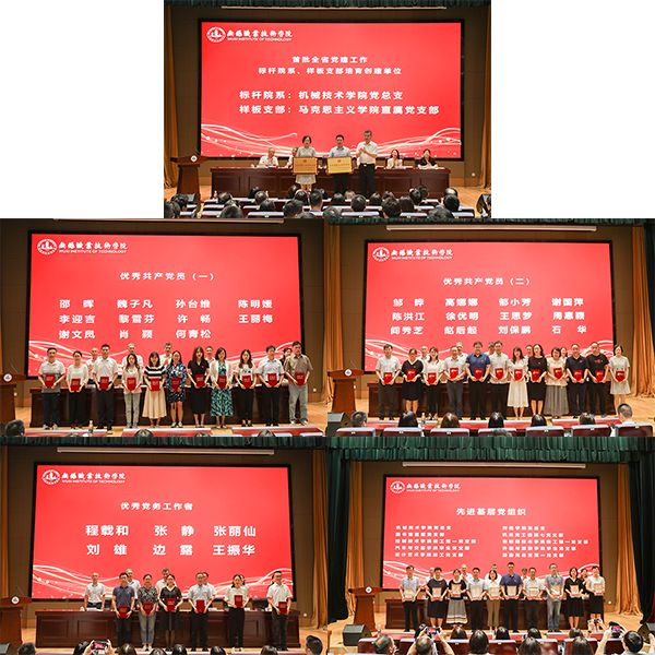大会在庄严的国歌声中拉开帷幕。校党委副书记周桂瑾同志宣读表彰决定。与会校领导分别为受表彰的先进个人与先进集体颁奖。机关党工委机关第七党支部孙台维同志、财经学院党总支刘雄同志、机械技术学院党支部书记王骏同志分别代表优秀共产党员、优秀党务工作者和先进基层党组织作交流发言。