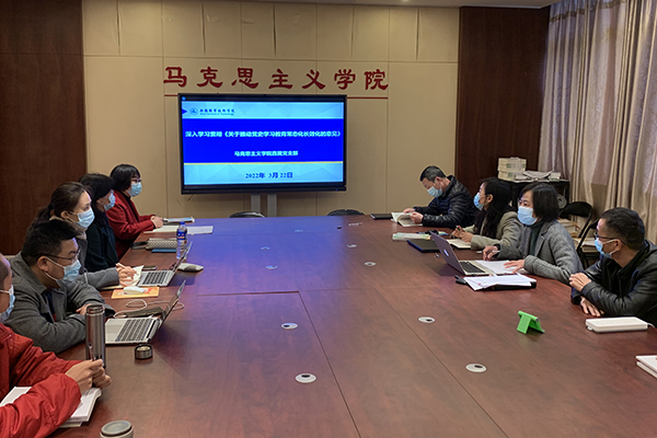 近日,中共中央办公厅印发了《关于推动党史学习教育常态化长效化的意见》,3月22日下午,马克思主义学院直属党支部利用线上线下平台相结合的方式,组织全体教师认真学习文件精神。