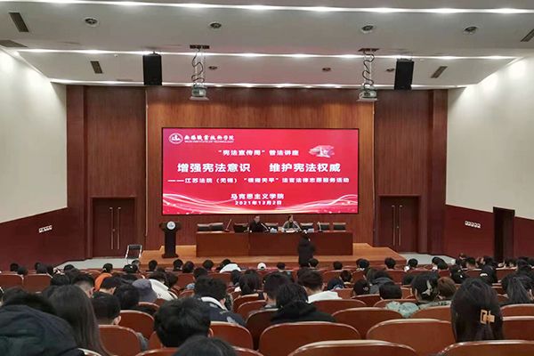 为增强青年大学生的宪法意识,弘扬宪法精神,推进宪法实施,12月2日晚,马克思主义学院邀请无锡市中级人民法院庭长华俭学、原机关党委副书记李锦蟾来校开展“宪法宣传周”普法讲座活动。讲座在国际交流中心一楼报告厅举行,我校大一全体本科同学和部分高职同学参加活动。