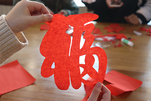 传统的民俗剪纸也承载着传统节日里的美好祝愿,营造着祥和的节日氛围。郭老师给大家讲述了“五福”的涵义,也带来了“福”字和原创的漫画老虎形象,让大家先从模仿开始,照样子剪出作品,为即将到来的春节做好准备。最后,师生们进行作品装裱展示并与郭老先生合影留念。