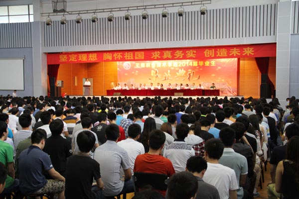 毕业典礼上,顾京副校长作2014届学生毕业、结业情况通报,华坚副校长宣读了2014届优秀毕业生名单。我校共有2014届毕业生3531人,其中163名同学因在校期间表现出色,获得了“优秀毕业生”荣誉称号。怀着激动的心情,优秀毕业生和部分毕业生代表走上主席台,从到场校领导手中接过了荣誉证书和毕业证书。