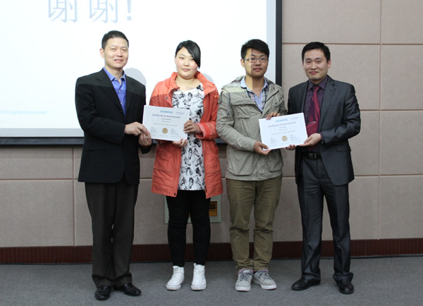 会议期间,西门子资深软件工程师就“西门子创新技术--加速产品设计的新利器”及成功客户案例进行了专题报告;王文华总监和江苏智远数字科技发展有限公司总经理雷虹为我校21名EDIM认证同学颁发了证书。与会代表还参观了我校的汽车实训中心和智能工厂。