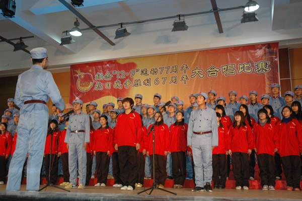 为纪念12·9学生爱国运动77周年、抗日战争胜利67周年,弘扬爱国主义光荣传统,营造良好的校园文化气氛,12月11日晚,由校团委主办、控制技术学院承办的大合唱比赛在大学生活动中心举行。校团委副书记谢欢、控制技术学院党总支副书记苗勇等嘉宾与1000多名师生共同观看了比赛,评委团由校团委和各院系分团委老师组成。