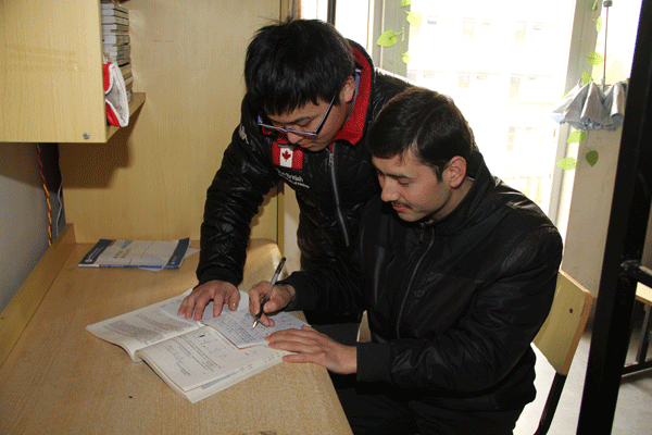 我校去年首次招收了30名新疆少数民族学生,为尽快让他们学好汉语和专业基础知识,我校组织优秀汉族学生与同宿舍的少数民族学生开展了 “一帮一”结对助学活动,图为36日机电21131班王尧在帮助伊里亚思温习课堂上的重点和难点知识。(郁飞)