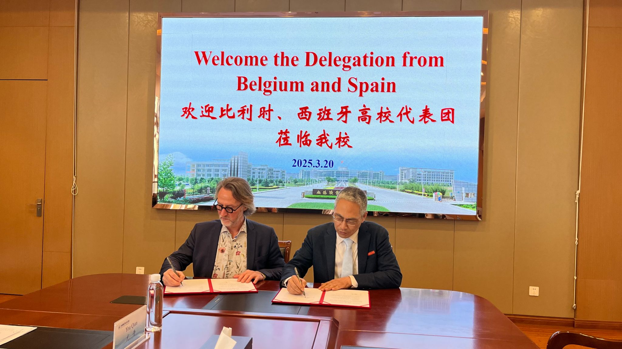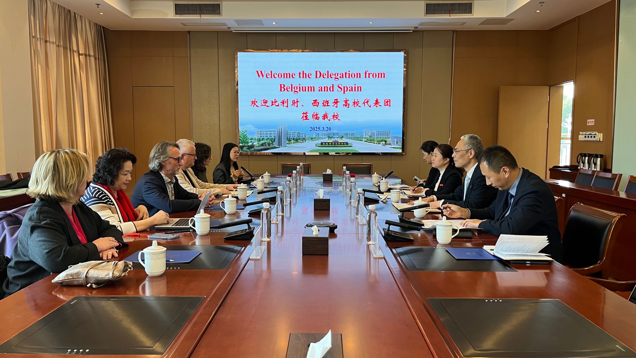 3月20日,比利时艾伯特雅卡尔学院,西班牙加泰罗尼亚中央大学-曼雷萨大学社会科学学院、商科国际项目,那慕尔中文学校及中德(欧)合作-产业技术服务平台国际教育项目相关负责人一行6人来我校访问,周桂瑾校长及国际交流合作处相关负责人接待了来宾,并签署了合作备忘录。