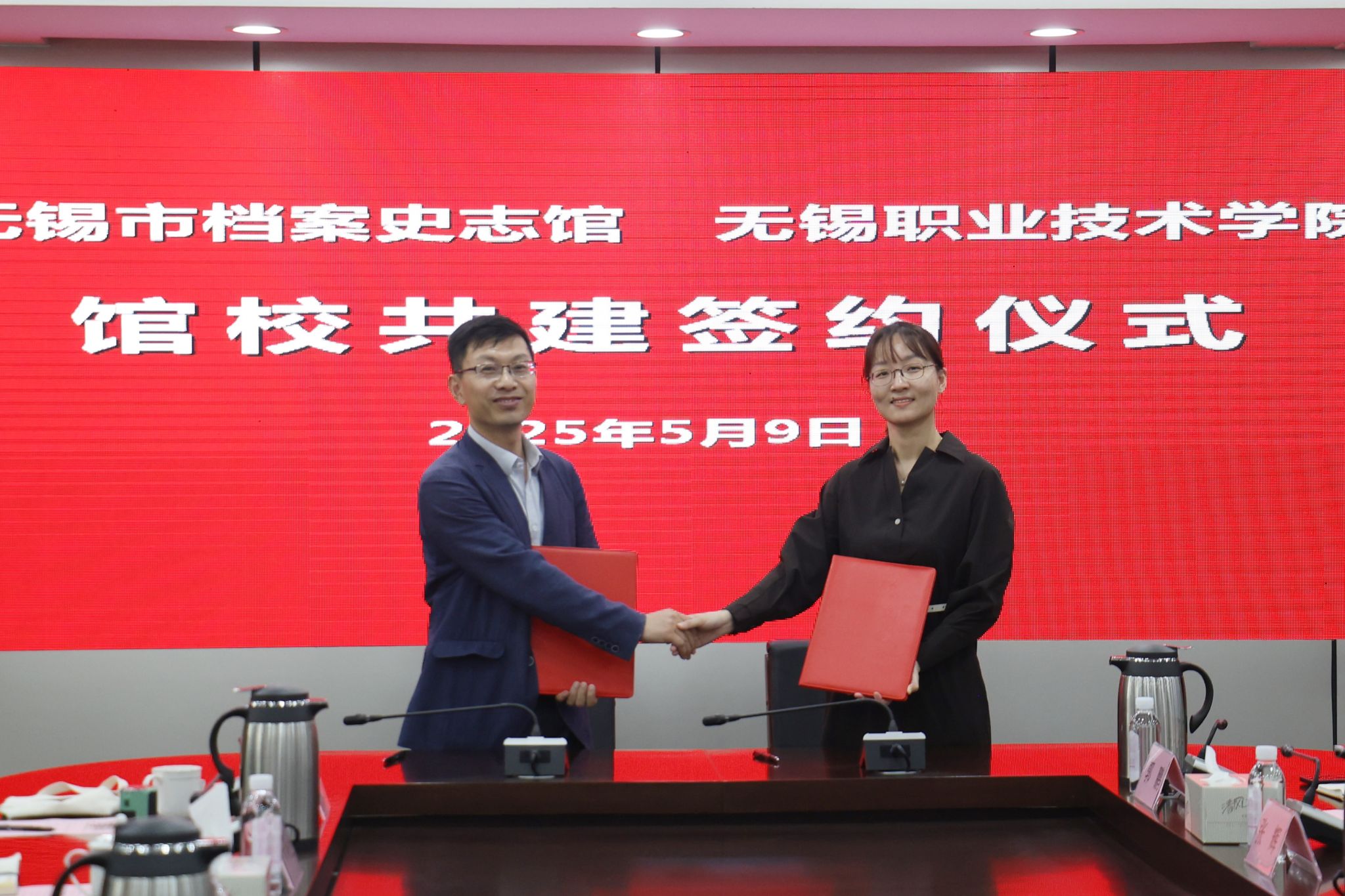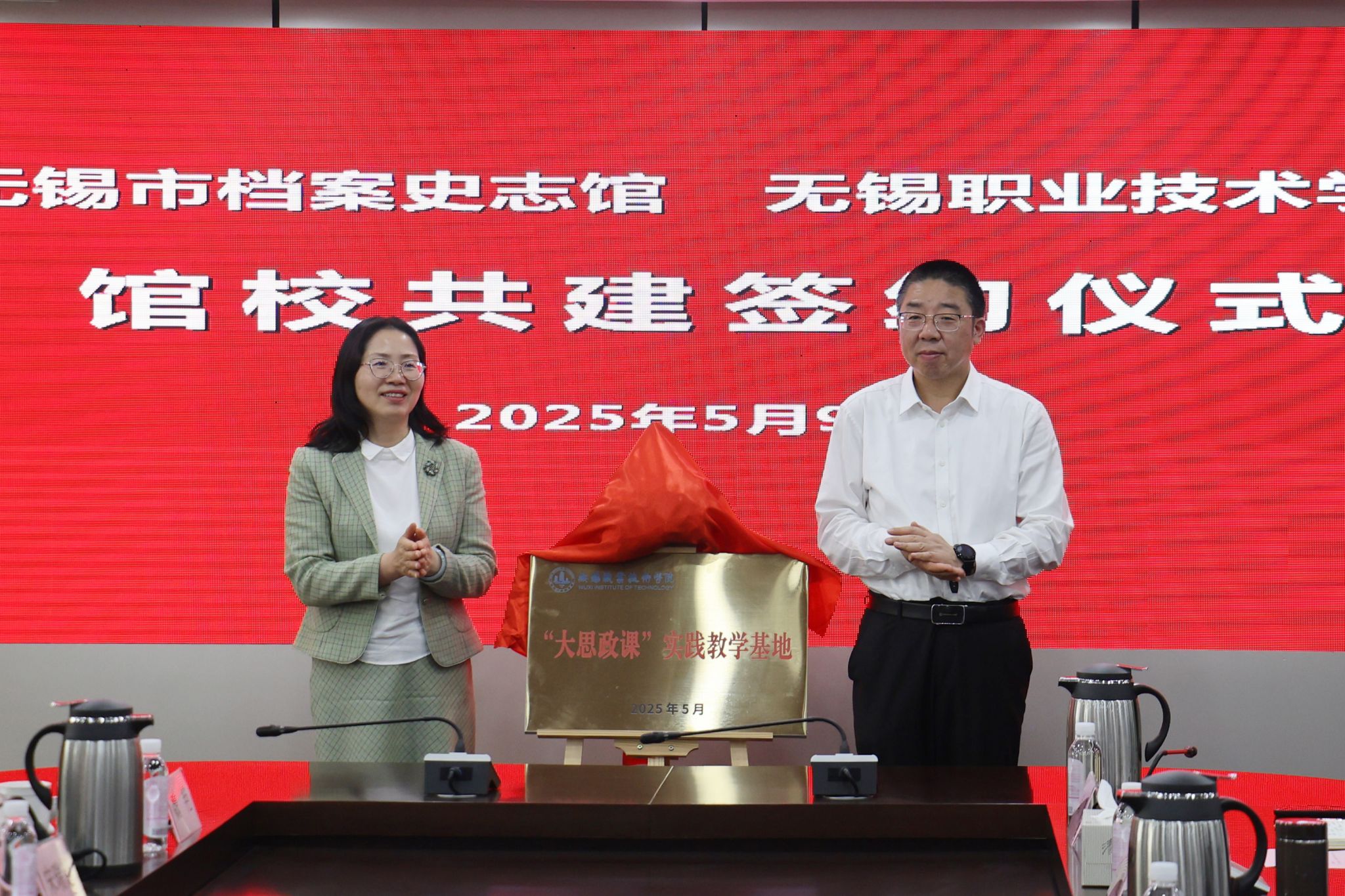 无锡市档案史志馆副馆长郑姣、我校马克思主义学院院长宋瑞超代表双方签署馆校共建协议书;接玉松、杨雪琴共同为“大思政课实践教学基地”揭牌。