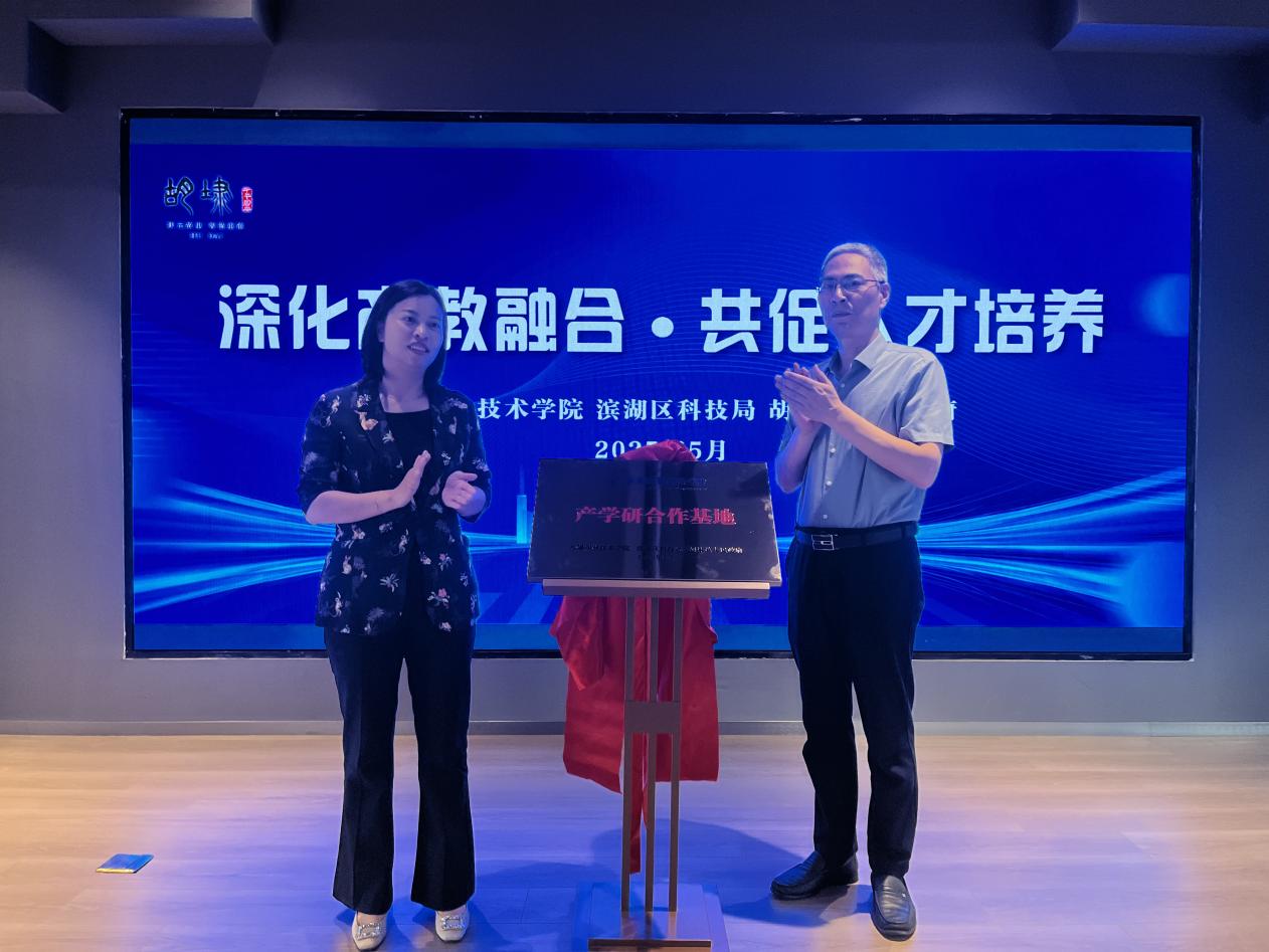 与会人员围绕企业需求、人才培养、产学研合作、学生实习就业等展开交流与洽谈,达成诸多共识。周桂瑾和沈媛共同为“产学研合作基地”揭牌,“校企地”签署《产学研合作框架协议》《就业创业合作协议》。