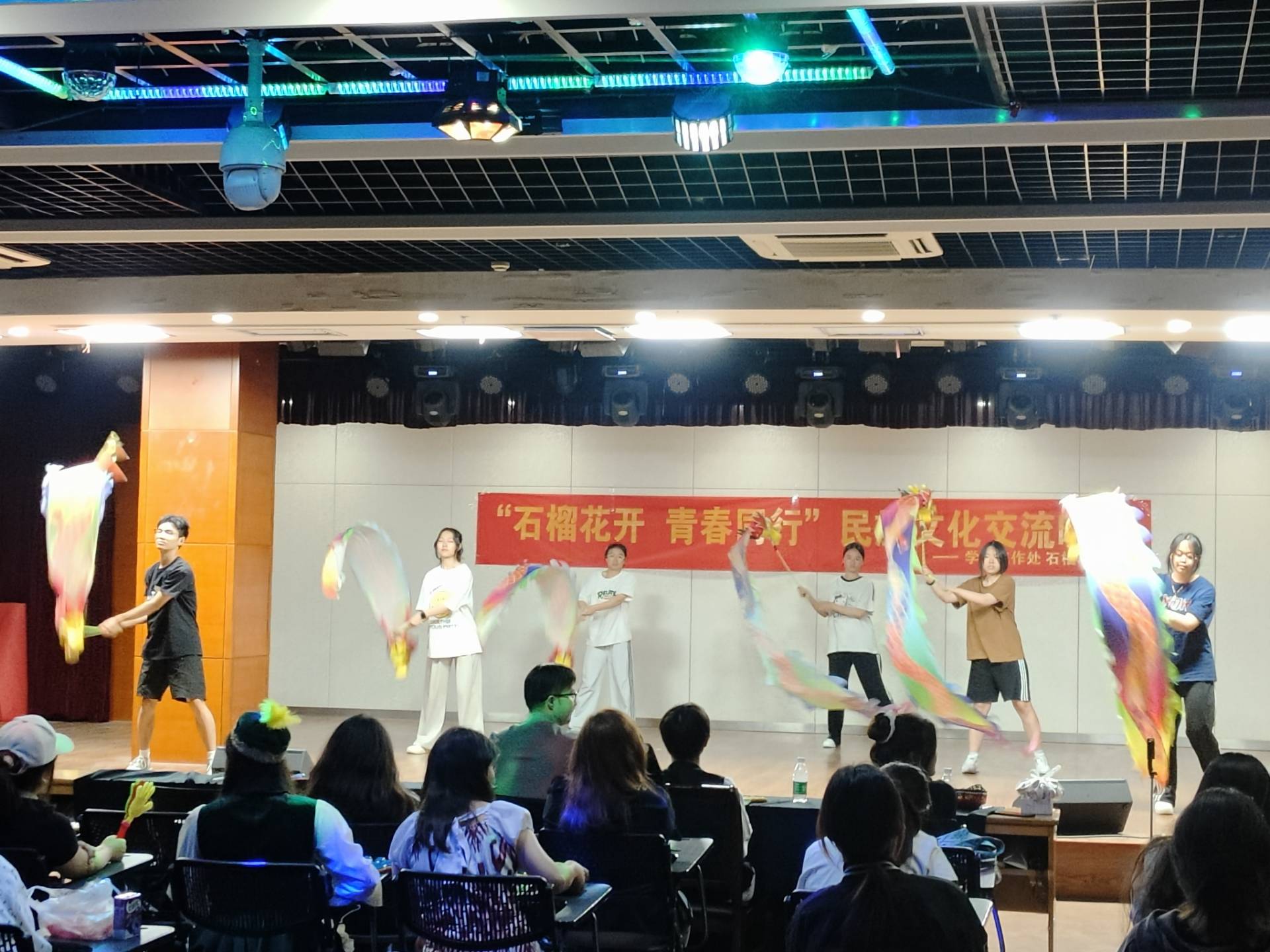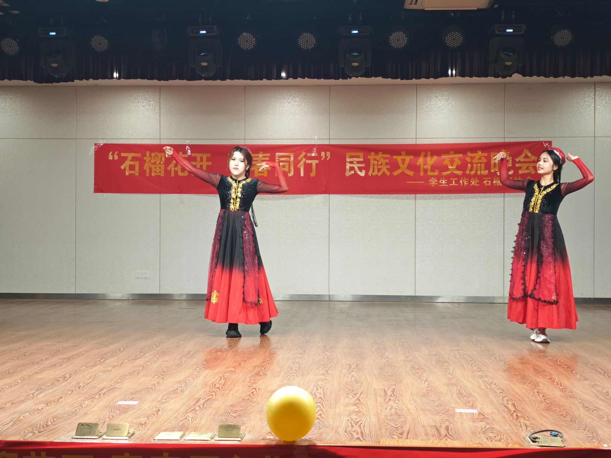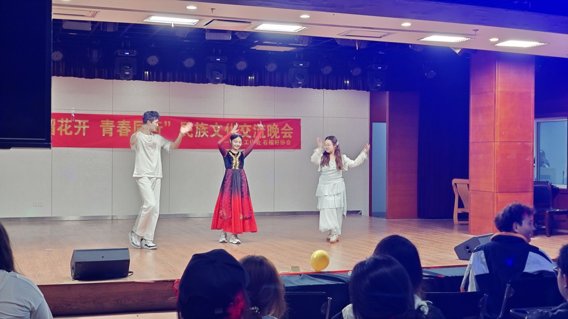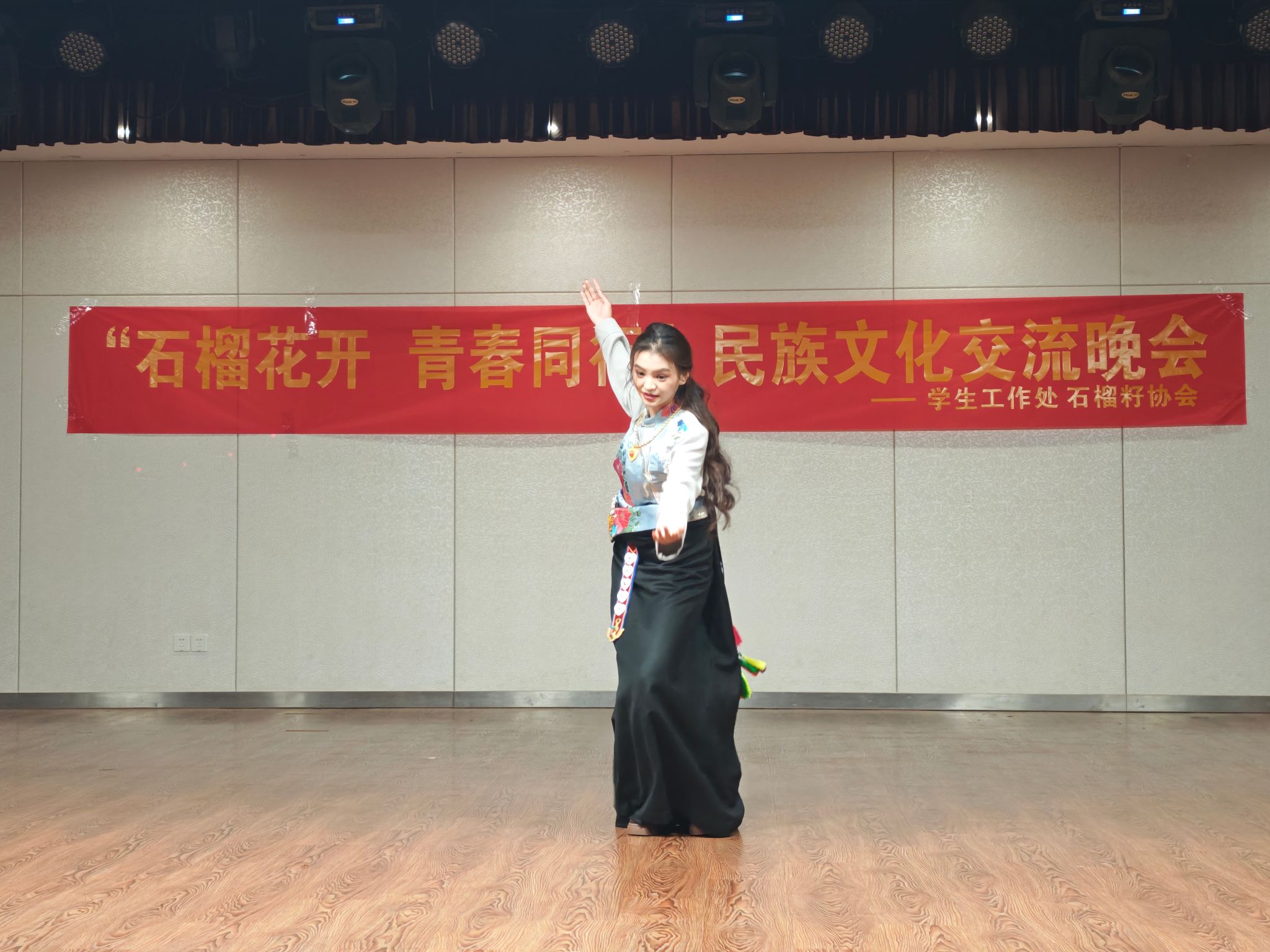 为扎实推进学校铸牢中华民族共同体意识教育,鼓励各民族学生当好民族团结进步的宣传者、示范者和践行者,5月23日晚,大学生活动中心青春剧场内灯火璀璨,由学生处主办、石榴籽协会承办的"石榴花开·青春同行"民族文化交流晚会举办,吸引了百余名师生共同参与,通过艺术展演促进各民族文化的交流互鉴。