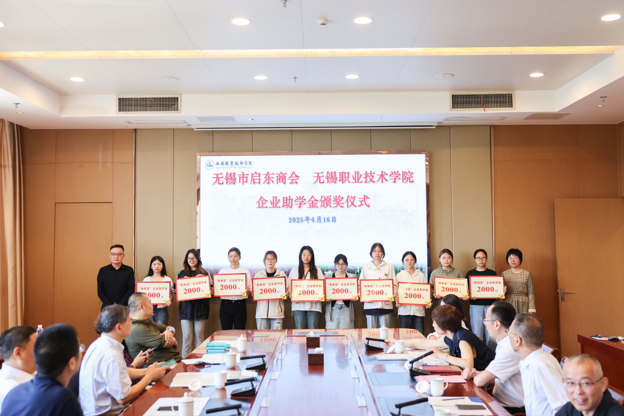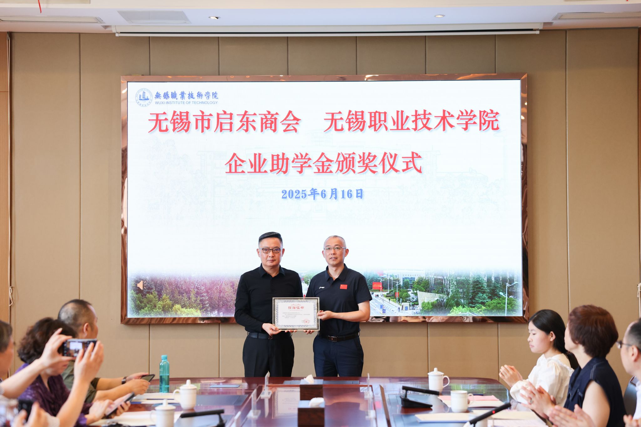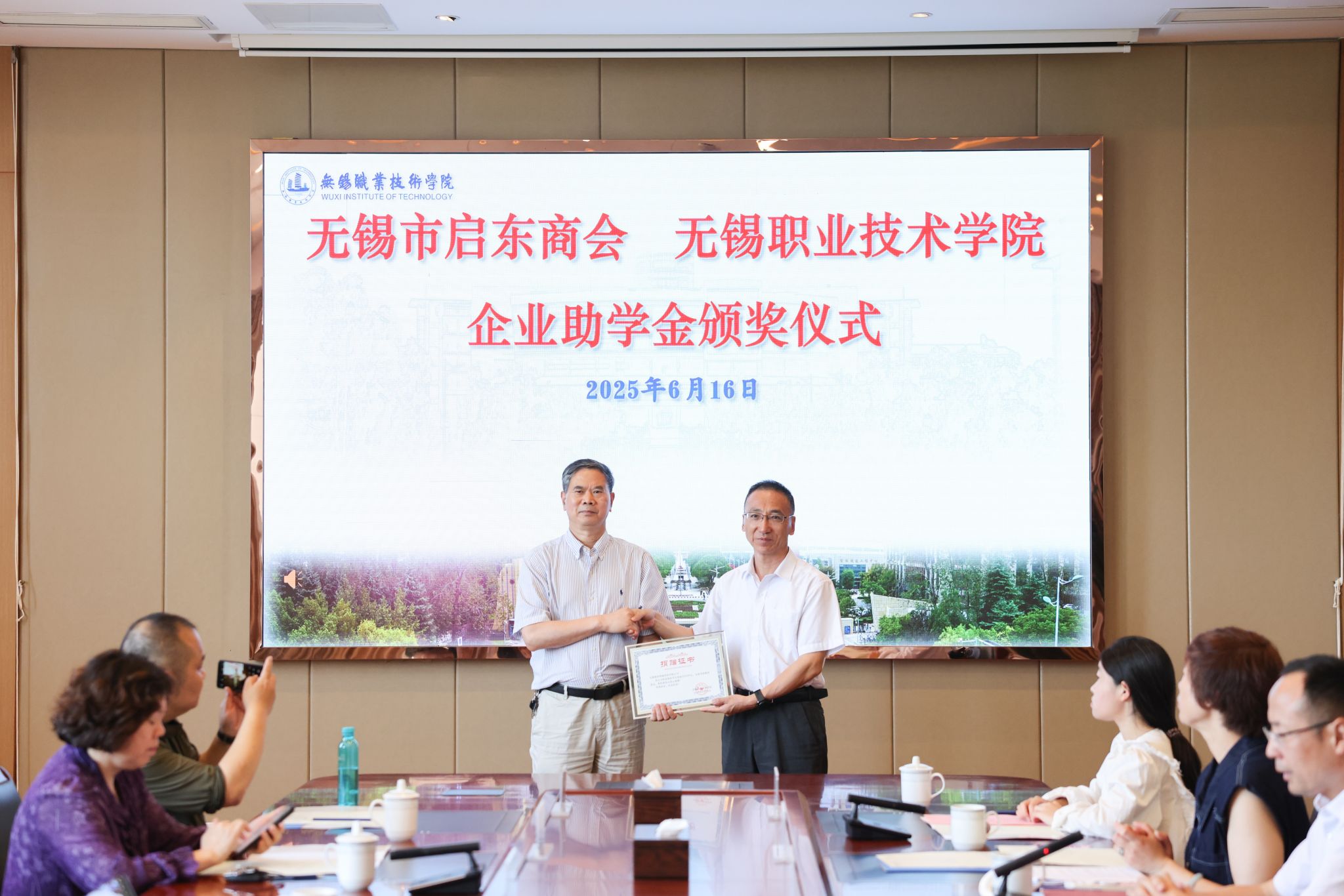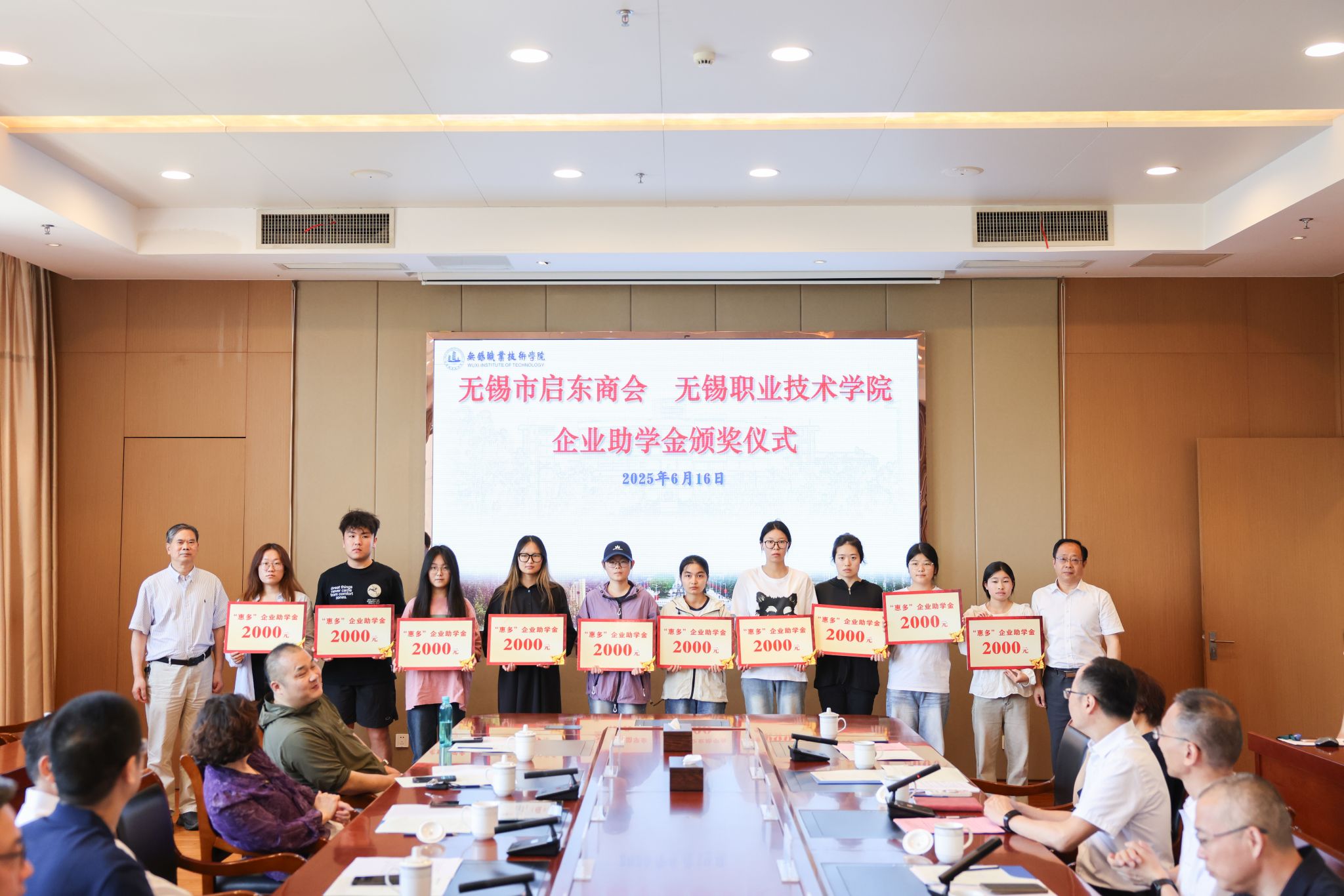6月16日上午,无锡市启东商会企业助学金颁奖仪式在厚德楼F201会议室举行。无锡市启东商会会长陆军等一行7人,我校党委书记龚方红、副校长强伟纲,学生处、财经学院、管理学院等有关部门领导以及受资助的20名学生参加,体育部党总支书记宋静辉主持仪式。