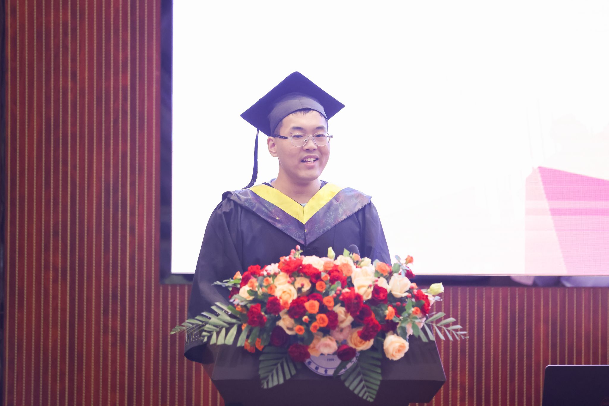 教师代表机械工程学院张韬老师向毕业生们送上祝福,勉励同学们勇敢追寻内心的渴望,创造真正属于自己的理想生活。物联网32141班高乐同学回顾了在校期间所学、所感、所获,表示无论身在何方,都将以两校荣光为甲,以双训精神为剑,为中国制造、中国创造开疆拓土。