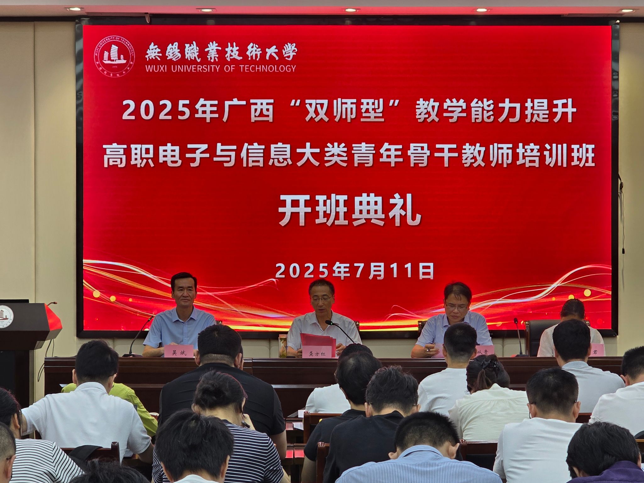 7月11日,广西“双师型”教师能力提升高职电子与信息大类青年骨干教师培训班在我校正式开班。本次培训由我校集成电路学院承办,来自广西壮族自治区34所高职院校的36名学员参加了开班仪式。学校党委书记龚方红,集成电路学院党总支书记吴斌、副院长黄从贵出席开班仪式。