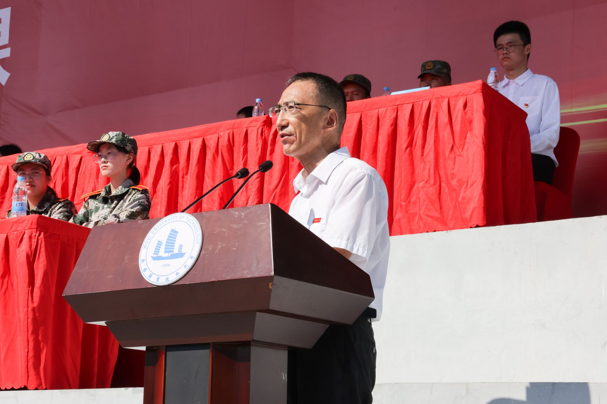秋风送爽,丹桂飘香。9月15日上午,学校2025级新生开学典礼暨军训动员大会在体育场举行。校党委书记龚方红、校长周桂瑾、武警驻锡某部上校王涛、副校长储开峰、纪委书记李衔、副校长奚茂龙,有关职能部门、各二级学院相关负责人,及全体教官、2025级辅导员、班主任、新生参加大会。大会由储开峰主持。