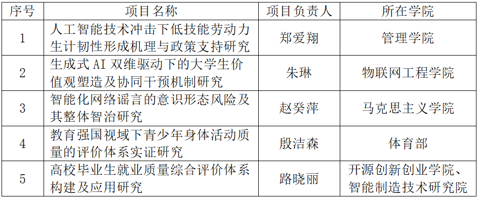 教育部人文社会科学研究项目覆盖面广、权威性高,是衡量高校人文社科科研水平与科研生产力的核心指标。我校立项的5个项目,涉及青年学生思想政治教育、网络舆论环境生态、青少年体质监测、高校毕业生就业评价及交叉学科等多个领域,项目负责人均持续关注相关领域并深耕研究多年。