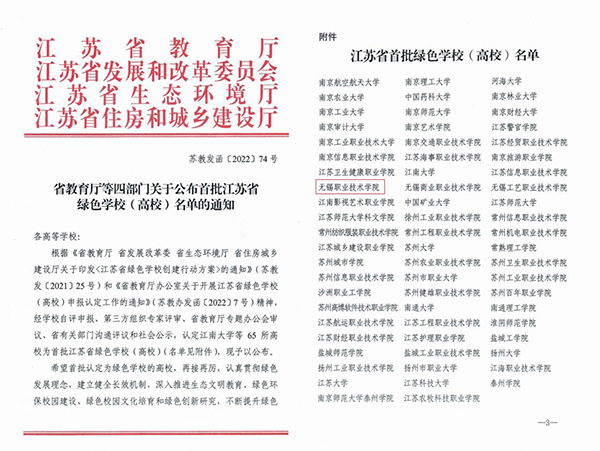 近日,江苏省教育厅、省发展和改革委员会、省生态环境厅、省住房和城乡建设厅等四部门联合发布首批江苏省绿色学校(高校)名单,我校位列其中。