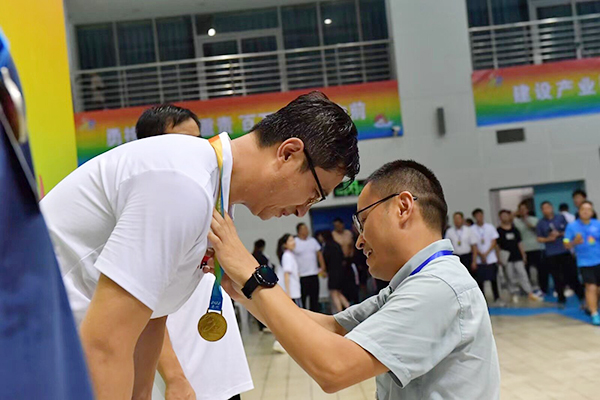 我校体育部教师盛鑫不畏酷暑,刻苦训练。比赛中认真研究战术,充分发挥自身体能、技术优势,沉着应战、勇于拼搏,斩获中年男子组100米蛙泳金牌、50米蛙泳铜牌,并与队友合作,获得中年男女组4*50自由泳银牌、4*50米自由泳铜牌的骄人战绩,充分展示了我校教师昂扬向上、拼搏进取的良好风貌。