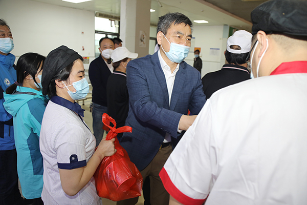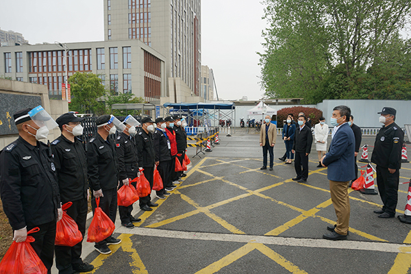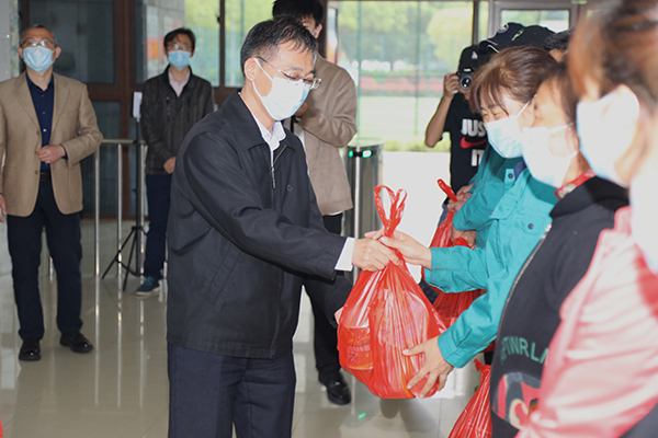 4月13日,校领导朱爱胜、龚方红、周桂瑾、杨雪琴、强伟纲带领党办校办、保卫处、学生处、后勤处等相关部门负责人,走访慰问了校园封闭管理期间仍奋战在疫情防控一线的教职员工。