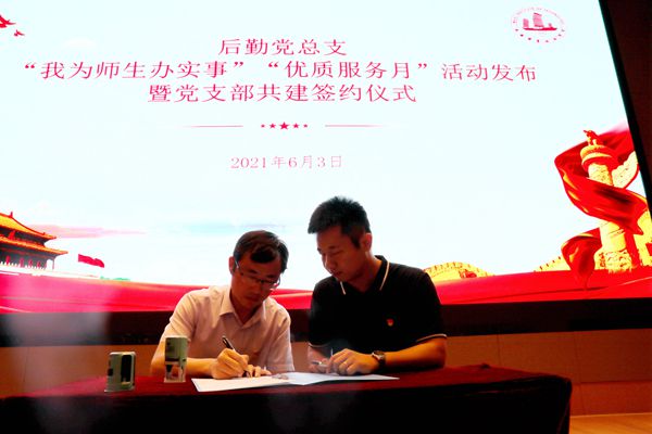习近平总书记指出,要坚持以人民为中心的发展思想,着力办好群众各项“急难愁盼”问题。为贯彻学校《关于开展党史学习教育的实施方案》,聚焦解决师生反映最强烈、最直接的服务问题,6月3日上午,后勤党总支举办“我为师生办实事”优质服务月活动暨党支部共建签约仪式。省委教育工委党史学习教育派出第三指导组观摩了活动,校党委副书记周桂瑾、副校长强伟纲出席了活动,后勤党总支和财经学院党总支党员师生代表近160余名参加。后勤党总支副书记宋静辉主持活动和签约仪式。