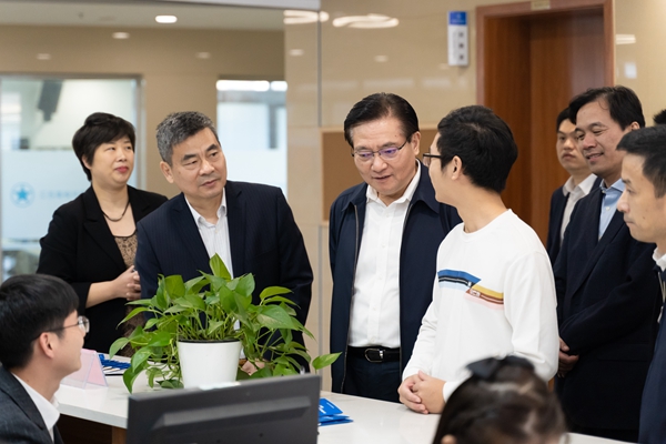 随后,黄钦一行来到了学生事务服务中心和学校共青团青智库。在一站式服务大厅,黄钦详细了解了事务中心运行状况,并和正在办理业务的学生亲切交谈,询问了相关情况,得知学生可以在此一站式办理所有业务时,他频频点头。在青智库,黄钦饶有兴致地听取了相关汇报,希望学校进一步坚持立德树人根本任务,培养更多高水平技术技能型人才,服务地方经济,为推进苏锡常都市圈职业教育改革创新打造高质量发展样板贡献力量,并表示,“十四五”期间,市委市政府将进一步支持学校建成领军全国的智能制造特色校,推进学校各项事业再上新台阶。