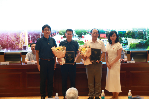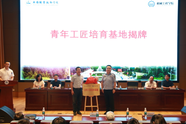 市监局杨瀚博和机械工程学院党总支书记王振华为“青年工匠培育基地”揭牌。首批江苏省辅导员名师工作室主持人、机械工程学院党总支副书记王丽梅和副院长曹澍为首届“十大工匠”代表丁浩、杨岳民颁发“客座教授”聘书。