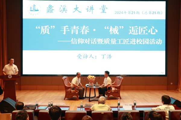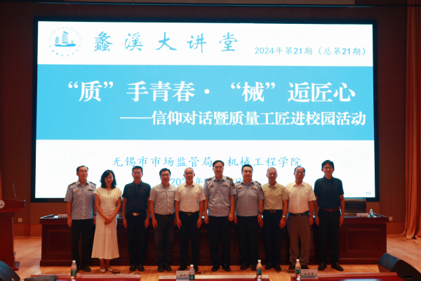 9月24日,在全国“质量月”期间,由无锡市市场监督管理局和机械工程学院共同承办的“‘质’手青春,‘械’逅匠心——信仰对话暨质量工匠进校园活动在厚德楼一楼报告厅顺利举行。市监局四级调研员张强、质量发展处处长杨瀚博、首届“十大工匠”代表丁浩、杨岳民、我校副校长强伟纲、机械工程学院领导班子、学院特聘技能大师——“大国工匠”顾秋亮、相关老师和200余名学生参加本次活动。