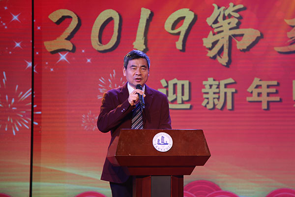 演出之前,校党委书记朱爱胜代表学校党委和行政向全校师生员工致新年贺词。朱爱胜书记指出,刚刚过去的2018年,我们伴随着伟大祖国在新时代前进的最强音,学校发展再上新台阶,胜利召开了第四次党代会,吹响了“建设领军全国的智能制造特色校、创建特色鲜明的高水平应用技术大学”的前进号角。这一年,我们的教育教学改革成果丰硕,科研服务水平持续提升,学生服务工作成绩显著,师资队伍建设取得突破,国际影响力持续扩大,文化建设不断增强。2019年是承上启下、继往开来的关键一年,我们要以学习贯彻习近平新时代中国特色社会主义思想为首要政治任务,深入贯彻落实党的十九大精神和学校第四次党代会精神,进一步解放思想、深化改革、对标补差、创新发展,坚定不移把新时代星空app官网推向前进。
