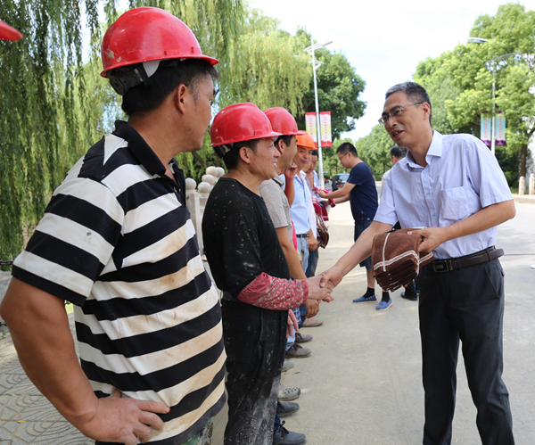 周校长一行分别深入到蠡溪河道、学生宿舍、教学西区、体育馆等维修改造工程现场,详细了解工程项目施工和暑期工作有关情况,并送去了毛巾、矿泉水等慰问品。
