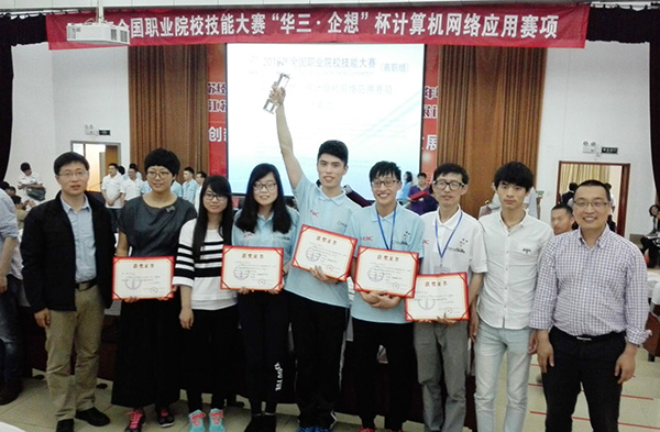 今年的计算机网络赛项共有来自全国58所高职院校的代表队参赛,我校代表队由物联网技术学院王欣、高琪琪老师指导,娄瀚文、姬智慧、田飞翔组成,继2014年、2015年相继获得一、二等奖后,今年再度问鼎冠军。