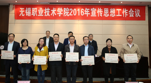 与会领导为获表彰的先进集体和个人颁发了证书,吴慧媛、赵健、徐悦三位同志分别作为先进集体、先进个人和优秀二级网站代表作交流发言。随后,谈向群副书记宣读了2016年学校各部门、学院对外宣传报道指标。