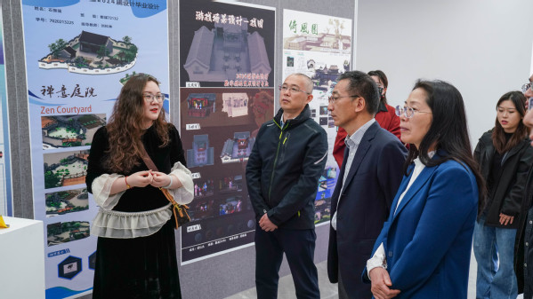 4月28日上午,设计艺术学院“设计之源,创意之道”2024届毕业设计展在崇德楼一楼开幕。校领导龚方红、杨雪琴、强伟纲,无锡市数字媒体技术研究会会长史正明等行业企业专家受邀参加活动。