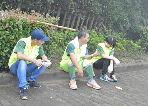 一天的体验,大家晒黑了,衣服湿透了,长时间弯腰作业也让好几位队员腰酸背疼。但正是这样艰辛的体验让他们倍感环卫工人的不易,更加坚定了要把关爱环卫工人、共同参与环保进行到底的决心。一位志愿者深情地说:我们一天的体验已很辛苦,而环卫工人们的辛劳却是日复一日循环往复的。带领大家体验的环卫工人也对志愿者们伸出了赞赏的大拇指。