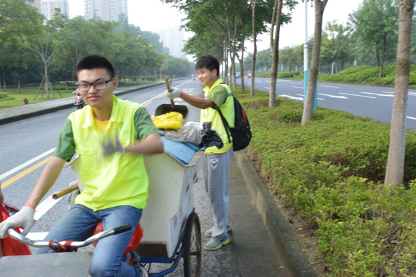 清晨的马路上早已微露酷暑的端倪,5点钟,队员们准时结合,扫把、火钳、簸箕、三轮车,大家认真地熟悉着每一件劳动工具。无论是钻入隔离带的树丛中捡拾垃圾,还是在行车道上清扫落叶;无论是在绿化带清理树枝,还是在垃圾桶旁擦拭灰尘,又脏又累的工作并没有让这群90后队员们退缩,他们越干越起劲。七点钟,辅导员老师送来早饭,队员们和环卫工们一起坐在马路边吃了起来。一位环卫阿姨说,平时都自己带早饭,干完活饭早已凉透了。