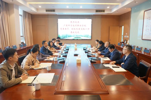 强伟纲对广东科学技术职业学院各位领导的来访表示热烈欢迎,并从办学概况、发展思路、主要举措等方面对我校基本情况进行简要介绍。他指出,双方具有良好的合作基础和广阔的合作前景,希望双方以此次交流为契机,不断凝聚共识、互相学习,持续深化在科学研究、师资队伍建设等方面的合作,进一步深化友谊、共谋发展。