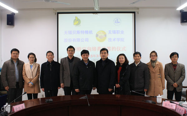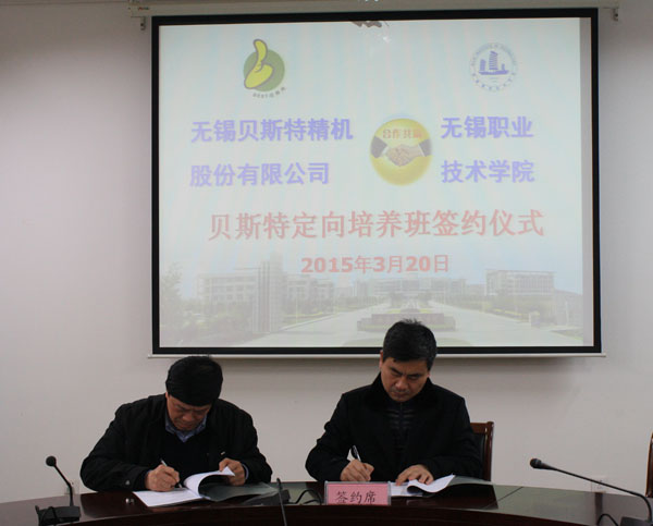 3月20日下午,我校与无锡贝斯特精机股份有限公司校企订单合作培养签约仪式在国际交流中心207会议室如期举行。贝斯特公司总经理兰恒祥、办公室主任周祖根、人事部经理杜晓群,我校党委书记朱爱胜、机械学院党政领导和部分教师代表参加了签约仪式。