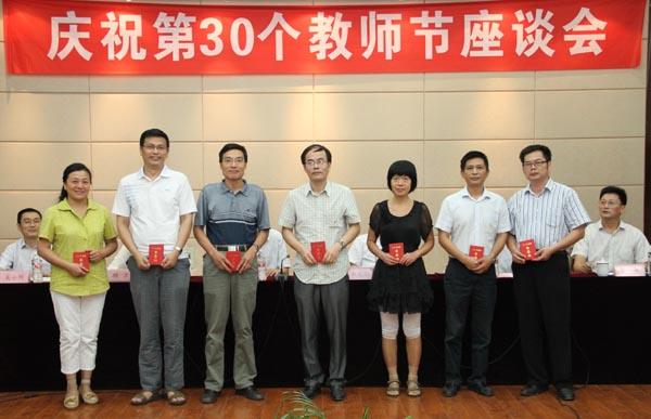 在第30个教师节来临之际,我校于9月9日下午在国际交流中心二楼报告厅召开座谈会,校领导朱爱胜、谈向群、华坚、顾京,工会、人事处、组织部等相关部门和院系负责人,教授博士代表、获表彰的优秀教师及优秀教育工作者、学生代表60余人参加了座谈。