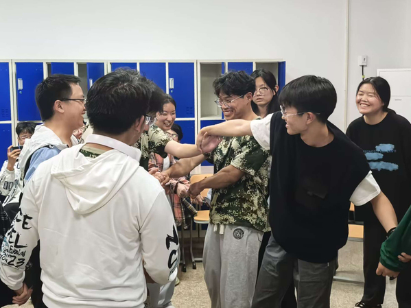 “大风吹”热身活动拉开了本次团体辅导的帷幕。各班新生在寻找彼此“相同点”“快速换位”活动过程中,发现彼此的相似,打破了彼此的陌生感。之后,同学们通过开展猜拳胜负开展“接龙”,在龙头带领下唱出“我们都是一家人”“相亲相爱一家人”的歌曲,提升了班级归属感。在 “围坐人椅”“打开千千结”等心理活动环节中,同学们进一步加深了彼此间的了解。同时,在带队老师的引导下,同学们用心分享了活动感悟,更加深刻地意识到班级建设需要每位成员的积极参与,团结协作和共同努力。最后,老生代表还与新生开展现场互动问答,为新生的学业生涯规划、大学生活等提出了建议。