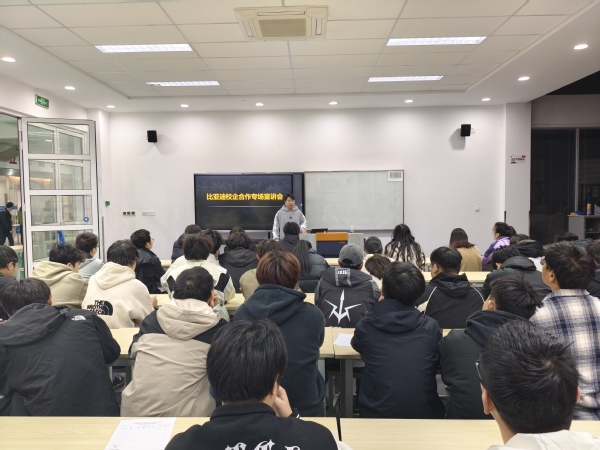 为进一步拓展毕业生就业渠道、深化校企合作,11月19日下午,汽车与交通工程学院在S112教室举办比亚迪(常州)校企合作专场招聘宣讲会,特别邀请了比亚迪第十一事业部经理晏启辉及其团队,为2025届毕业生带来了一场精彩纷呈的招聘宣讲与互动。