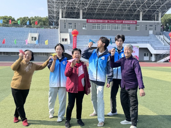 在学校操场上,志愿者们和正明村的老年人围坐成一圈,玩起了折纸飞机比赛。形状各异的纸飞机满载着大家的信心和希望飞出去,在空中交织出美丽的弧线。一旁观战的老年学员们也抓紧记录下与大学校园的亲密接触和美好回忆。老年人脸上都洋溢着幸福和欢乐的笑容,已然成为锡职学子一般。