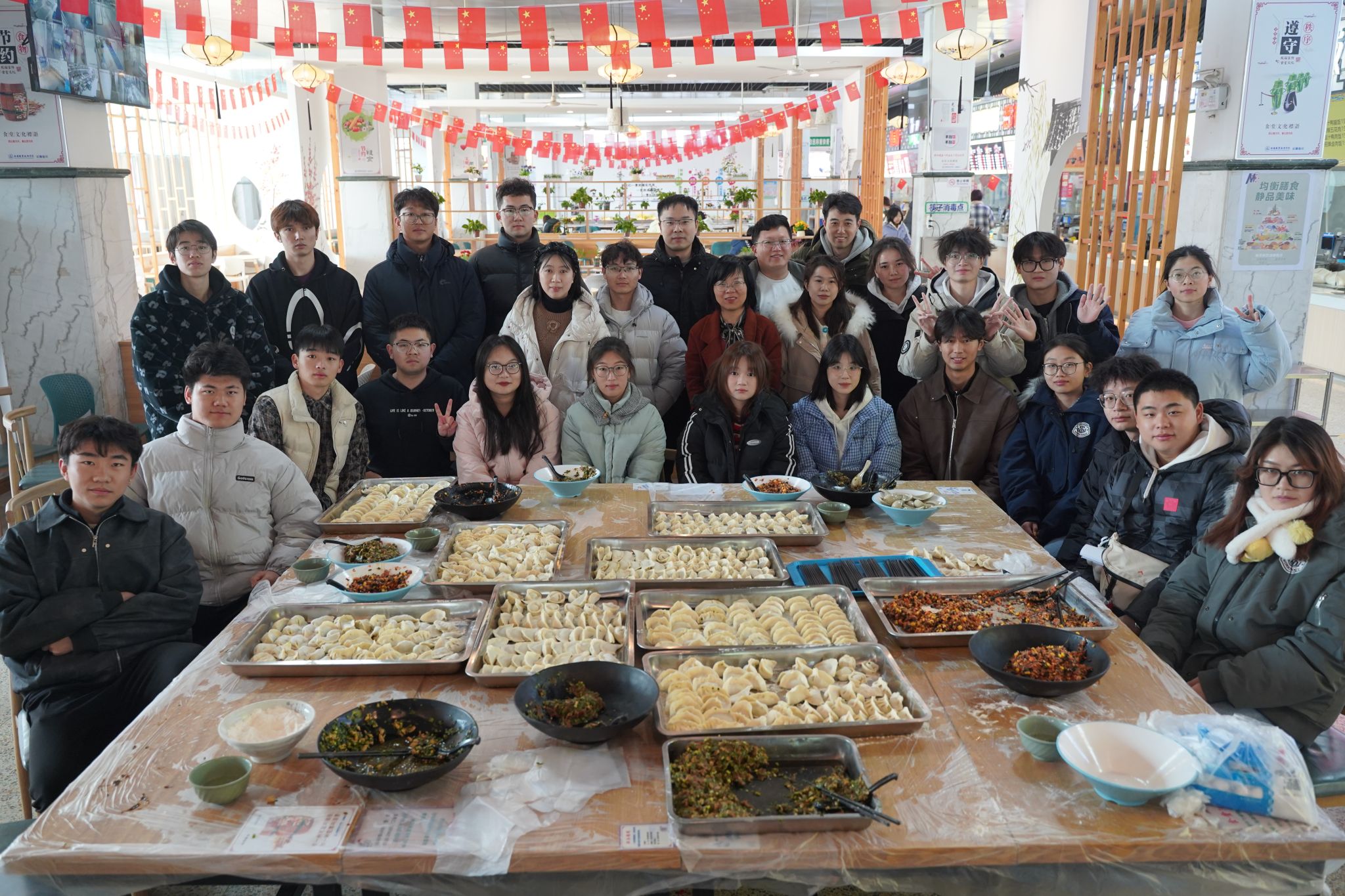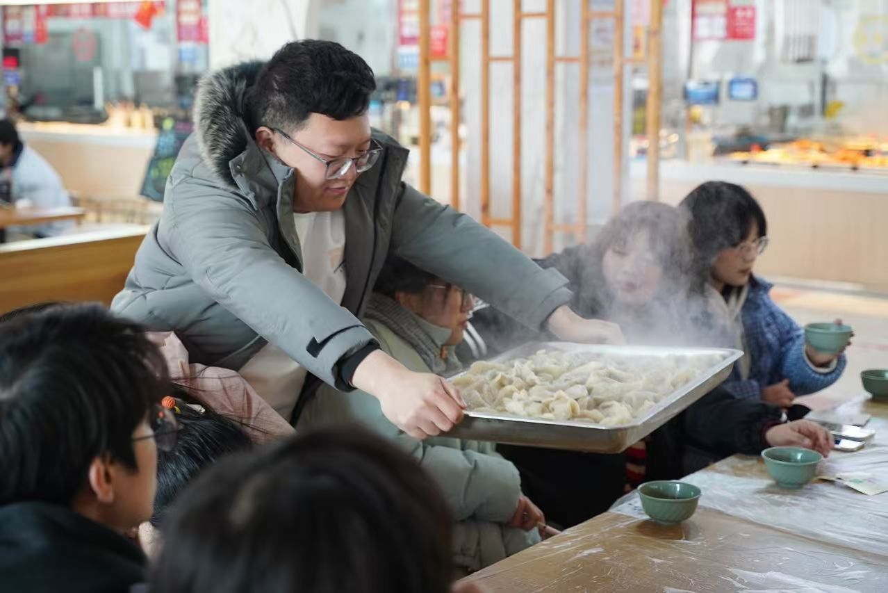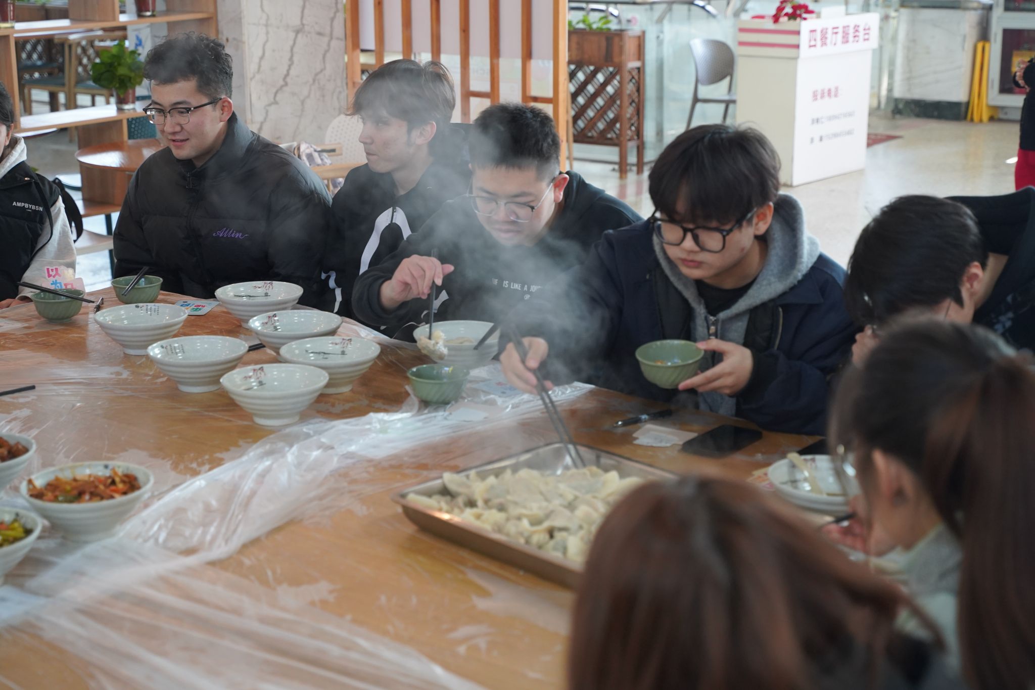 屋外寒气逼人,室内暖意融融。随着活动的开始,大家三五人一组,或站或坐,围绕着一张张摆满饺子皮、馅料和工具的桌子,迫不及待地投入到包饺子的乐趣之中。有的老师手法娴熟,一捏一折间,一个个饱满精致的饺子便成型了,引来周围同学阵阵赞叹;有的同学则是现学现卖,虽然饺子形状各异,但那份认真劲儿丝毫不减,在互帮互学中逐渐掌握了包饺子的技巧,从生疏到熟练,现场欢声笑语不断,气氛热烈融洽。在包饺子的过程中,老师们不仅与同学们分享了自己的生活经历和人生感悟,还关切地询问同学们的学习和生活情况,鼓励他们努力学习,继续前行。经过大家的共同努力,一盘盘热腾腾的饺子终于出锅了。师生们围坐在一起,品尝着自己亲手制作的美食,畅谈着学习生活的点滴,真切地感受着节日的温馨和幸福。