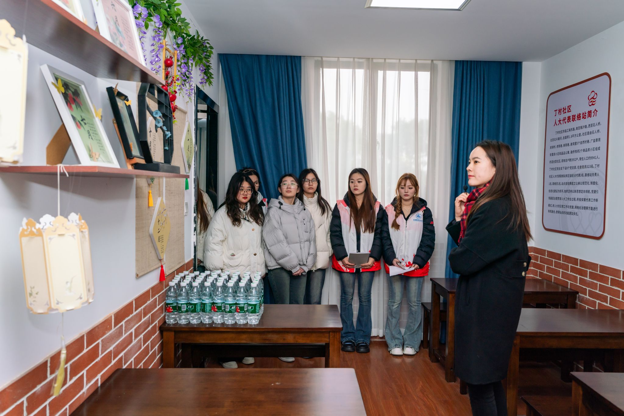 在本次活动中,我校师生还在丁村社区党总支副书记丁欢的带领下,参观了社区人大代表联络站。据悉,该联络站是对人大代表工作新模式的探索,将人大的日常工作与党建、网格化治理等方面进行有机融合,更好发挥了人大代表的作用。在联络站,同学们现场采访了广益街道辖区的人大代表及丁村社区网格员代表和基层管理人员代表,零距离了解我国基层民主运行机制和建设成就。