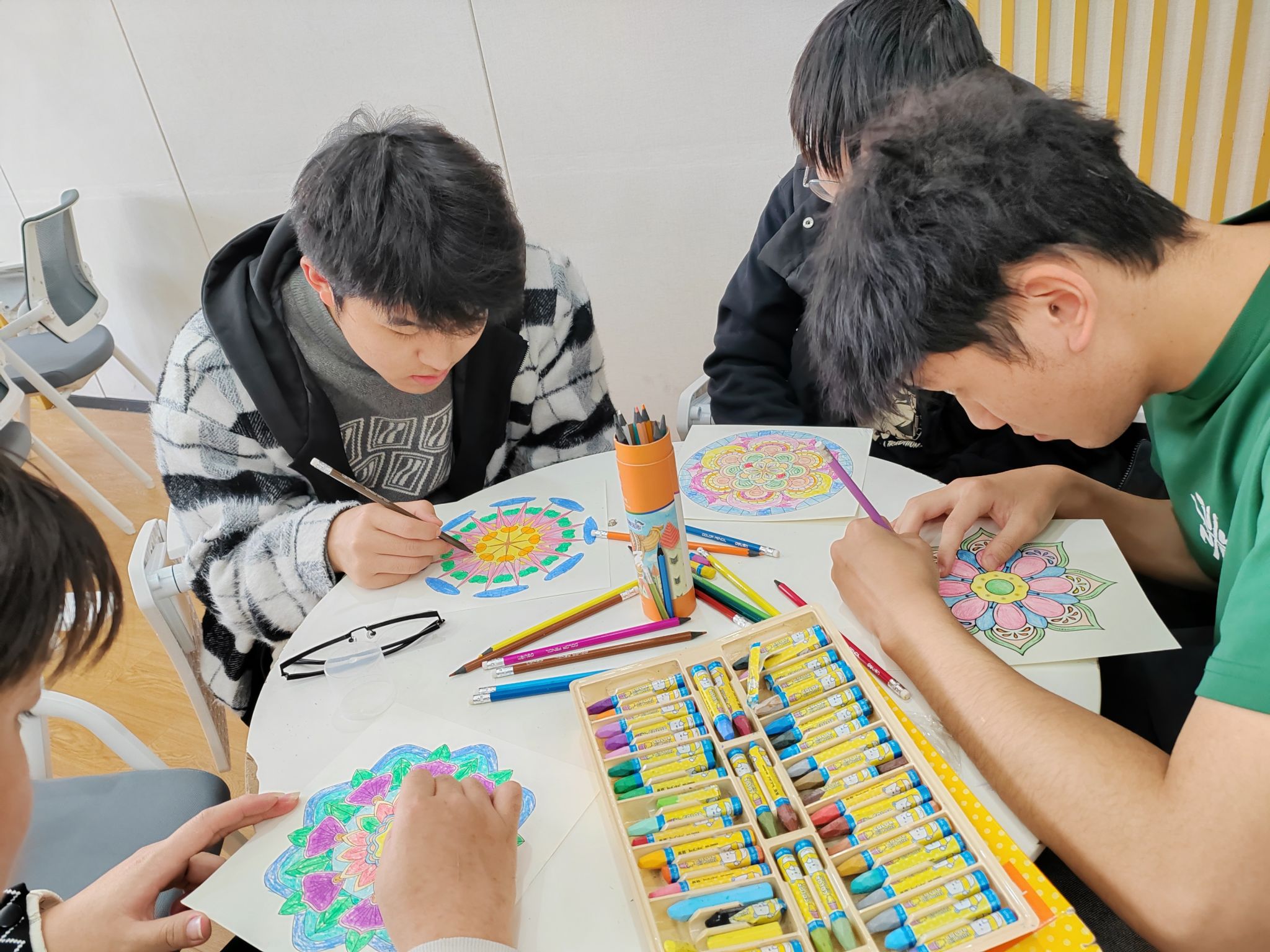 大家手持画笔,神情专注,挑选自己心仪的颜色,为眼前的曼陀罗图案赋予独一无二的生命力。从轻柔淡雅的色调到鲜艳浓烈的色彩,每一笔的落下,都仿佛是在倾诉内心的情感,将压力与焦虑渐渐转化为一幅幅绚丽多彩的艺术作品。无所谓对错与美丑,逐渐由无序到有序,沉浸于色彩搭配、专注于图案细节的学生,在这个过程中找到了属于自己的片刻宁静与内心平衡。