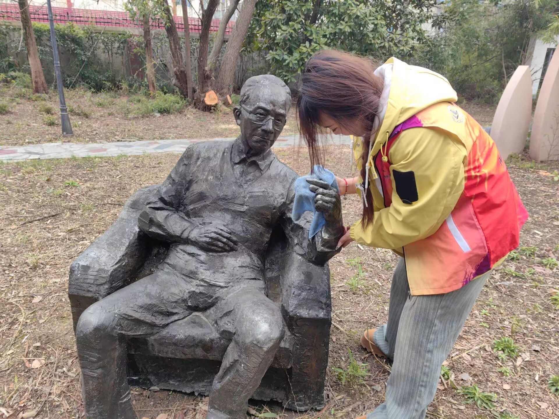 活动中,志愿者们认真清理雕像周围的垃圾,耐心除去雕塑上的灰尘,对雕像进行擦拭。大家拿着抹布和水桶,先用干抹布掸去雕像上的浮尘,再用湿抹布进行进一步清洁。志愿者们仔细擦拭着雕像的每一处细节,努力维护雕像的完整。擦拭过程中,看着雕像旁的无锡名人简介,同学们与无锡的杰出名人们仿佛进行了一场跨时空“对话”,深刻体悟前人奋斗精神,沉浸研习前人事迹。雕像旁的座椅近期正在进行实木更换,志愿者们主动协助工人进行实木搬运及安装,为校园创造更美好的环境。在我院青年志愿者们的认真工作下,带有厚重历史感的无锡名人苑焕发出全新的面貌。