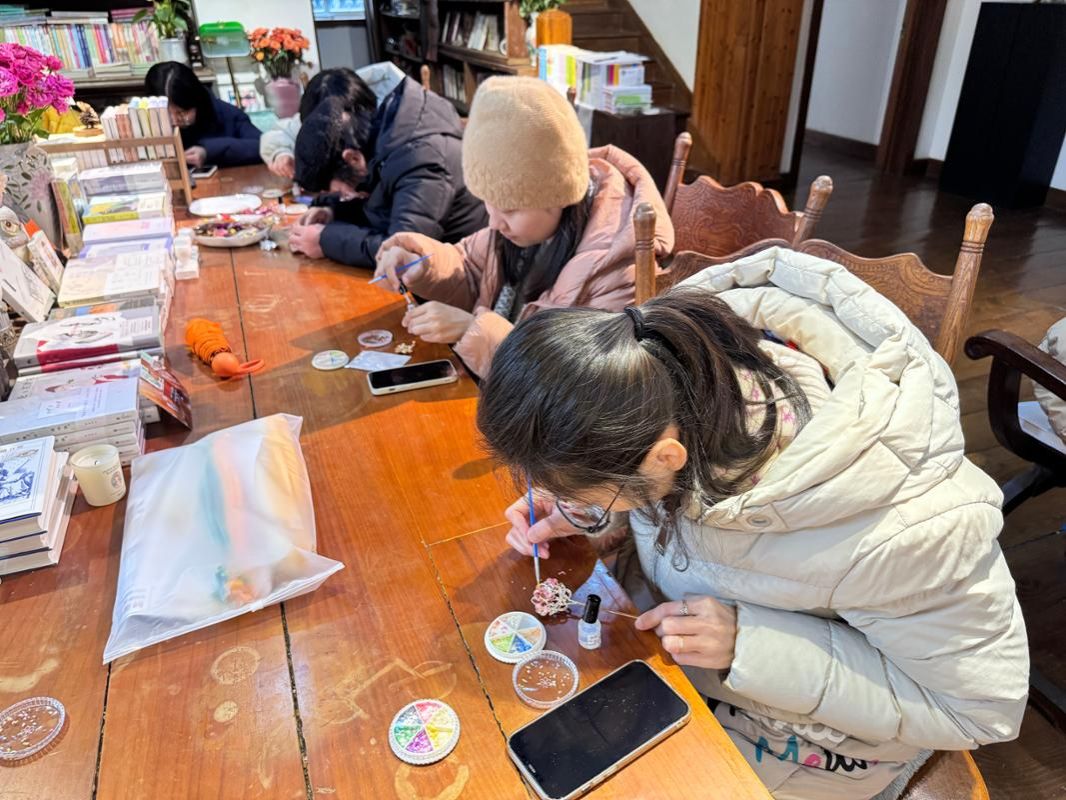 活动现场分为非遗螺钿胸针、发簪制作和扭扭棒团花扇制作体验两个小组。螺钿技艺传承千年,大家钦佩于其精妙的制作工艺,纷纷化身“匠人”,利用黏胶、小刷子等工具,将或厚或薄的各色螺片、贝壳片在胸针和发簪的金属托架上制成妙趣横生的花纹和图案,在阳光的映照下呈现出贝壳制品特有的流光溢彩质感。扭扭棒团花扇制作体验小组则沉浸在卷、捏、绕、粘、剪的工序操作中,大家分享着创作灵感,交流着手法技巧,不时传出阵阵欢声笑语。活动尾声,大家开心地拿着自己亲手完成的作品合影留念,记录下美好的瞬间。